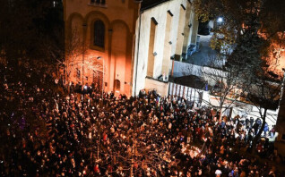 Mécsesek világítanak a lesötétített épület előtt.